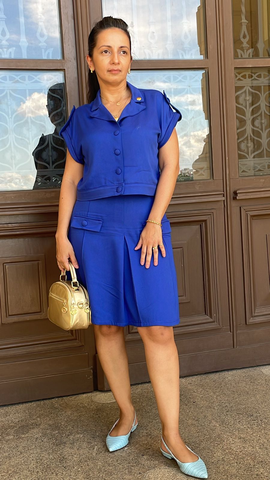 Blusa com manga japonesa e detalhes em martingale. Saia na modelagem evase com frizos e fenda falsa na frente.