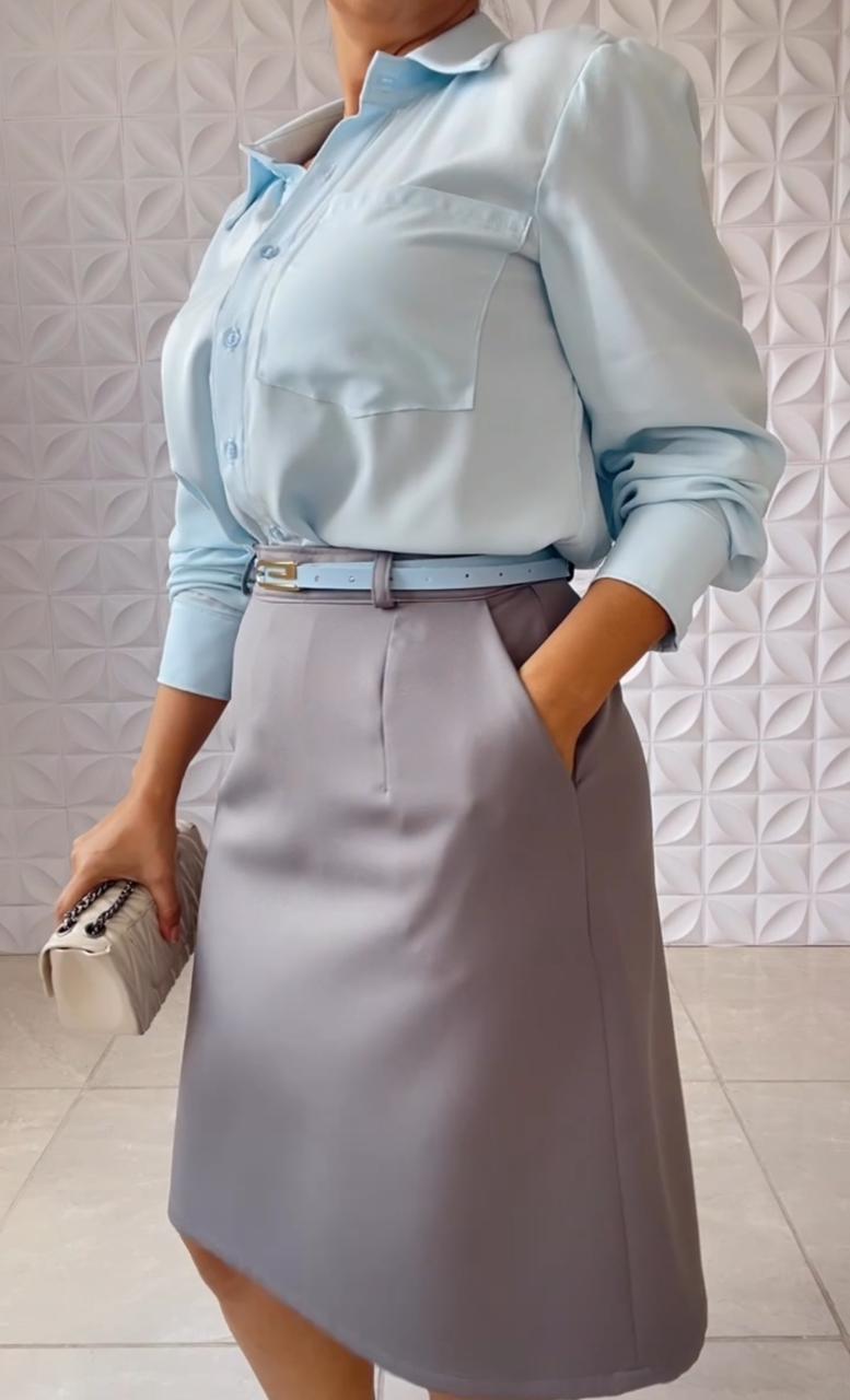 Saia Jéssica. Confeccionada em tecido alfaiataria, com cós e bolsos.